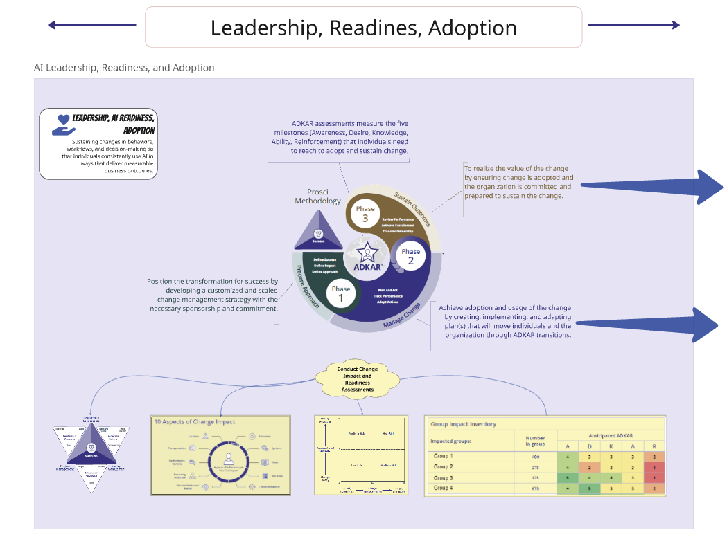 Meanwhile the link below (click the image!) demonstrates an example change/adoption dashboard based on the Prosci change adoption methodology. Tools like this can help leadership teams visualize adoption progress, identify barriers, and track reinforcement activities across the organization.